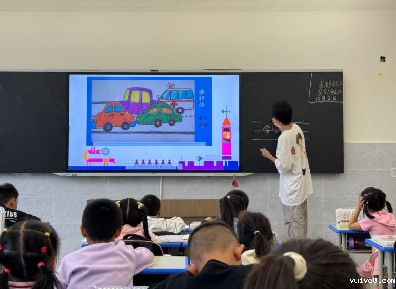 美术课堂上,李德麾老师以孩子们喜爱的动画视频进行导入,利用简单直观的教学手段,让孩子们轻松掌握排列法和遮挡法,更好地去描绘他们心中“繁忙的大街”。在学生创作时,李老师亲切地进行巡回指导,鼓励他们充分发挥自己的想象力和创造力,用色彩和线条绘出独特的城市街道印象。